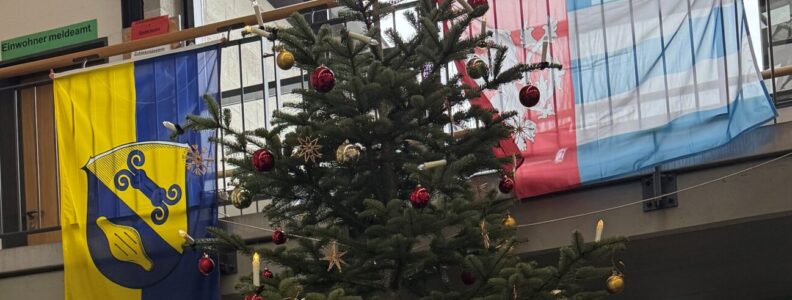 Mit einem Blick auf den Weihnachtsbaum im Rathaus, der von den Fahnen von Eschenburg und unserer Partnerstadt Bečov nad Teplou eingerahmt wird, wünschen wir Ihnen allen ein friedliches Weihnachts-Fest und ein gutes neues Jahr 2026.