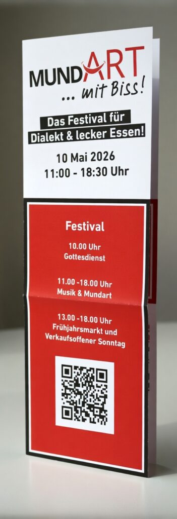 Für das Festival „MundART mit Biss!“ am 10. Mai 2026 in Eschenburg gibt es ein Plakat und Programm (hier PDF zum Herunterladen) in einem. Das Plakat ist im „halben“ DINA2-Format und hat das Programm auf der Rückseite. Einmal gefaltet, passt es gut in einen Umschlag. Wollen Sie vor Ort für das MundART-Festival werben und das Plakat aufhängen? Dann schreiben Sie einfach eine Mail ins Rathaus der Gemeinde Eschenburg und nennen Sie ihre Post-Adresse, wohin wir ihnen ein oder mehrere Plakate mit Programm schicken können.