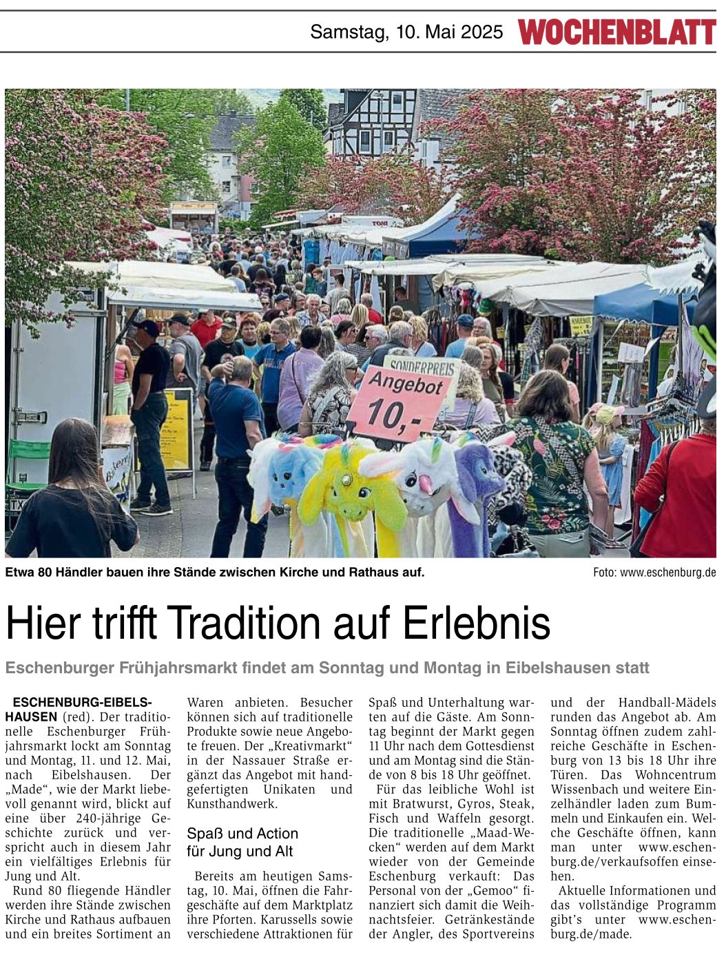 Sie sind hier: Home » Bürgerinformationen » Gute Geschäfte: Am 11. Mai ist von 13 bis 18 Uhr "verkaufsoffen" in Eschenburg » 250510 VRM Wochenblatt